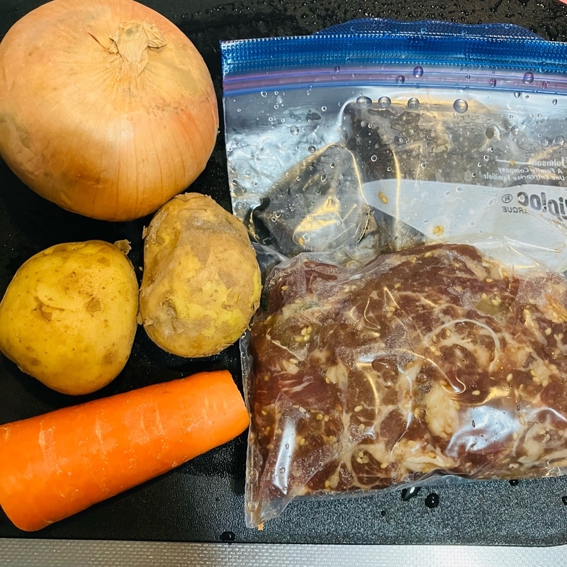③ホットクック内鍋に玉ねぎ→人参→じゃがいも→プルコギビーフの順番にいれる。